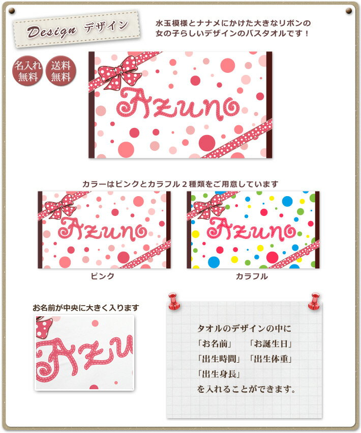水玉模様 dot ランダムドットパターン カラフルドット りぼん リボン wribbonお急ぎの方はバスタオルカタログギフトをどうぞ ⇒↑ 出産祝いに!名入れバスタオルの全部のデザインを一覧で見て選べます。