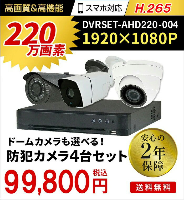 防犯カメラ 屋外 屋内 カメラ4台セット 220万画素 HDD 1〜4TB AHD ドーム 高画質 防水 赤外線 暗視 4ch 録画機 レコーダー 動体検知 家庭用 防犯カメラセット 選べるカメラセット 【送料無料】 DVRSET-AHD220-004